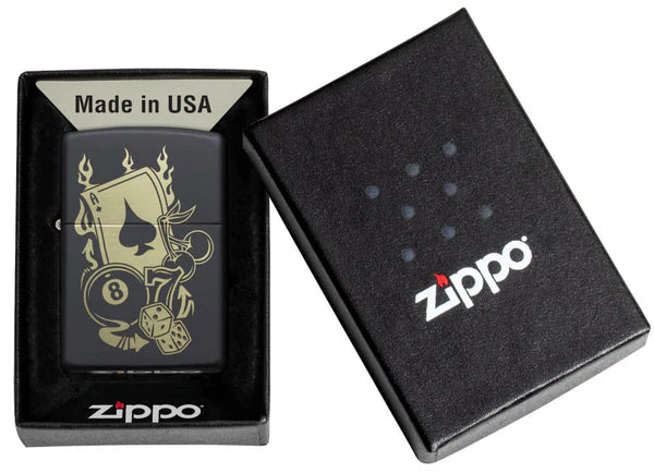 Take luck into your own hands, or pocket, with this Gambling Design. Laser engraved on a Black Matte lighter are numerous casino inspired elements. You can find an Ace of Spaces, the lucky number 7, a pair of dice, and more! Carry this lighter with you for some luck on your next trip to Sin City. Comes packaged in Zippo's premium box. For optimum performance, fill with Zippo lighter fuel.