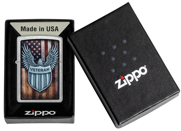 This classic Street Chrome lighter pays homage to all who defend our nation with a bold Color Image design featuring a "Veteran" badge over a muted American flag backdrop. Comes packaged in a gift box. For optimal performance fill with Zippo lighter fuel.